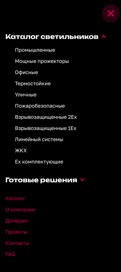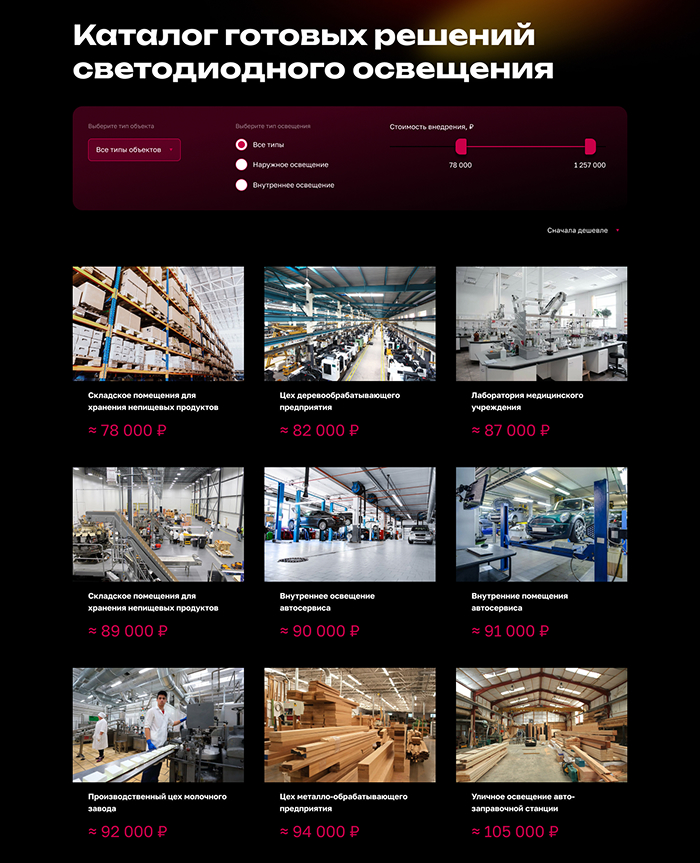 Помимо основного каталога, для повышения эффективности маркетинговых кампаний и SEO-продвижения, мы разработали подробные, высококонверсионные лендинги для каждой ключевой категории продукции. Каждое семейство продукции представлено отдельной посадочной страницей, которая сфокусирована на конкретной потребности клиента, предоставляя исчерпывающую информацию, технические обоснования и примеры использования именно этой категории светильников.
