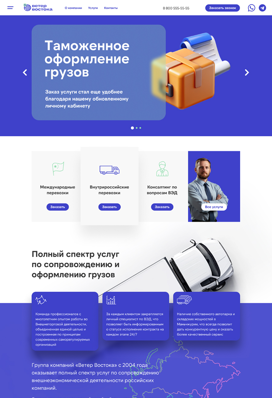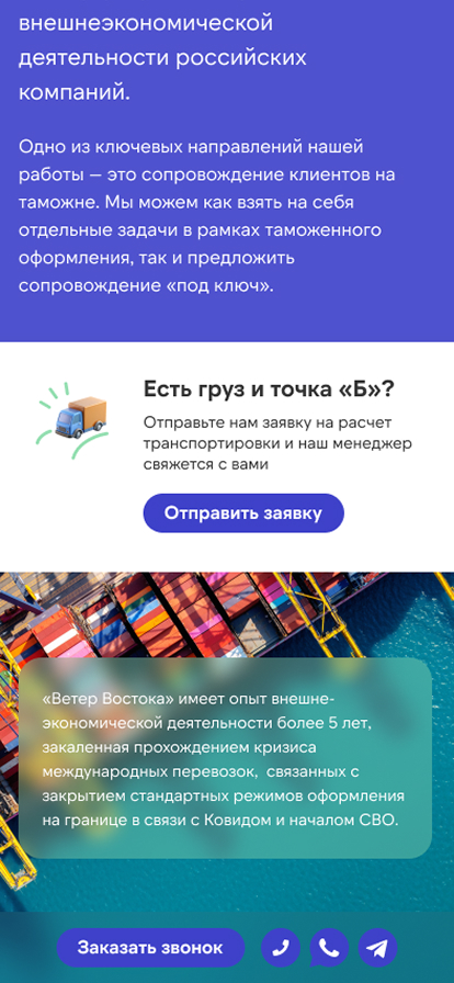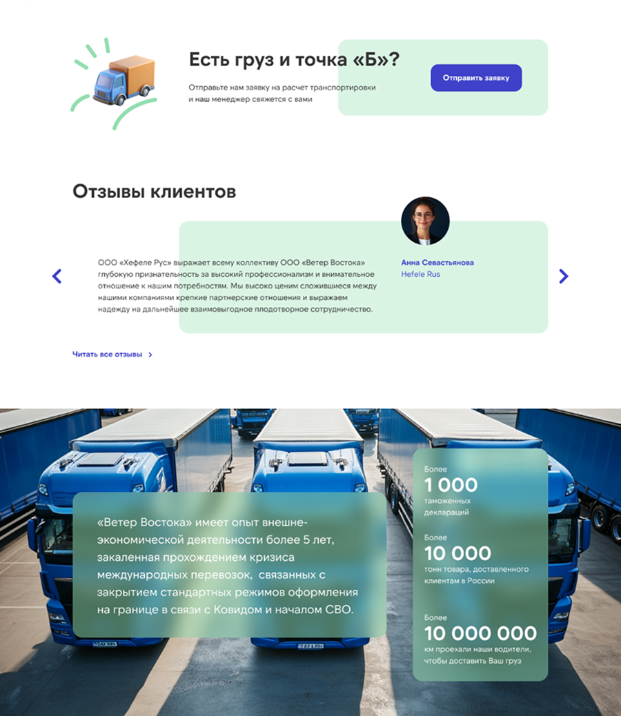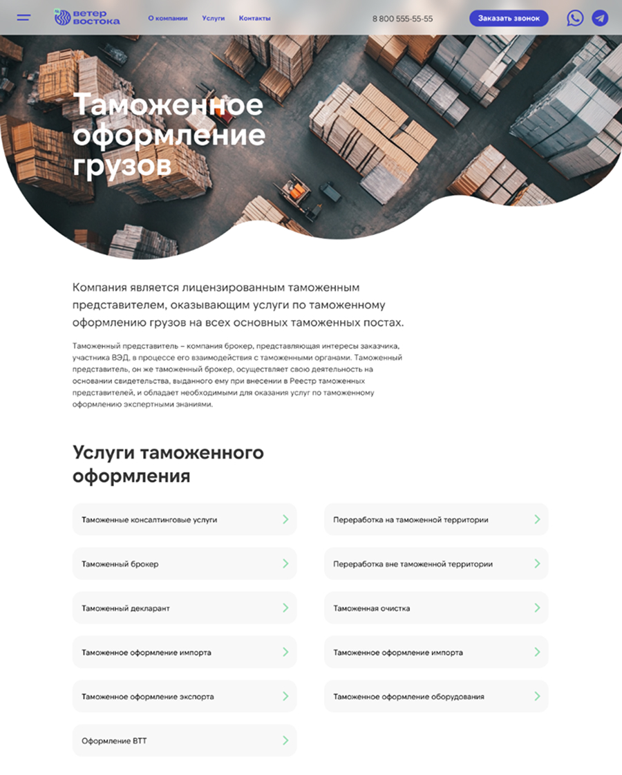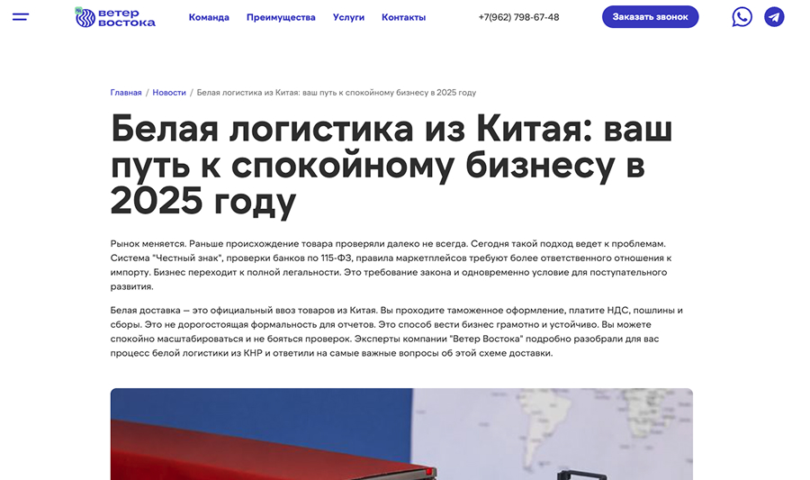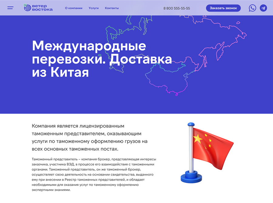 Компания «Ветер Востока» позиционирует себя как оператора бесшовной логистики. Достоверность этому обеспечивают собственные склады общей площадью 3 000 кв. м. на территории России и Китая. Нашей задачей являлся переход из статического представительства в многофункциональную цифровую платформу, ориентированную на высокую конверсию и клиентский сервис.