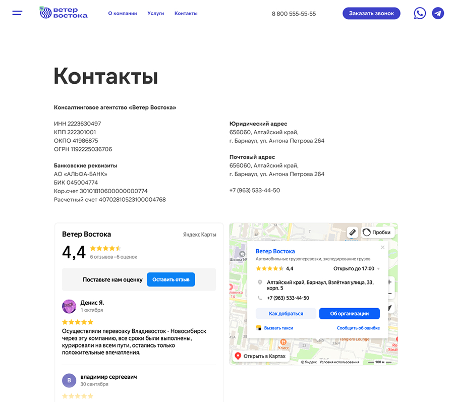 Сайт компании «Ветер Востока» сочетает чистый, конверсионный дизайн с реализацией расширенного функционала в виде связки отзывов с услугами и ценами. Эти наработки закладывают прочную техническую основу для дальнейшего масштабирования, автоматизации бизнес-процессов и укрепления позиций сайта в выдаче поисковиков.